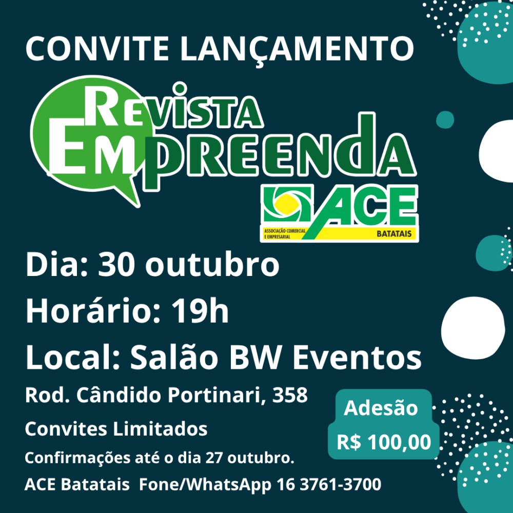 Está agendado para o dia 30 de outubro, quinta-feira, às 19h, na BW Eventos, a entrega da edição da Revista Empreenda 2025 para os representantes das empresas que adquiriram espaços publicitários. Neste ano, a entidade também convida para o evento todas as empresas associadas, com aquisição de convite unitário no valor de apenas R$ 100,00, com direito a buffet completo e show musical com Verônica Tozzi.MODELO DE POLÍTICA DE PRIVACIDADE E PROTEÇÃO DE DADOS