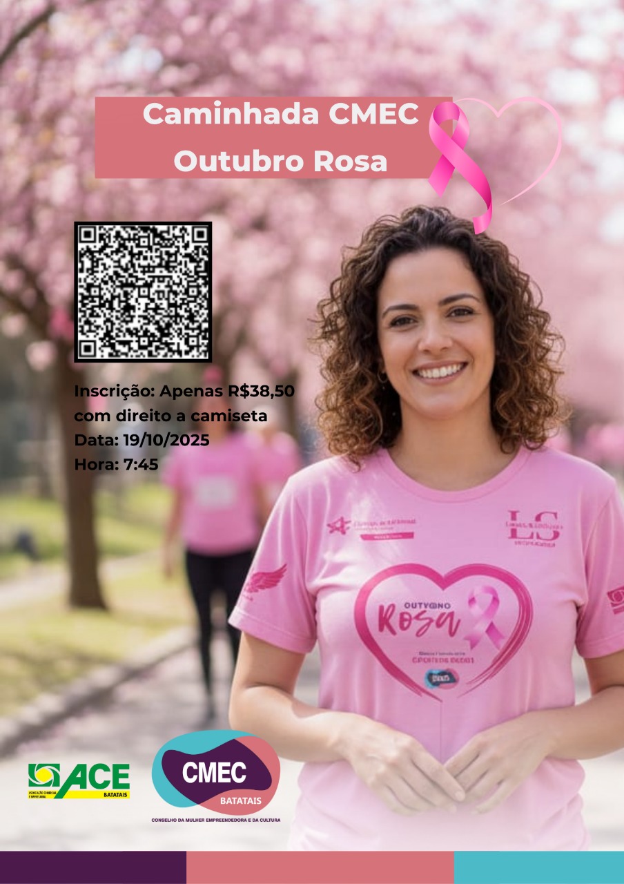 No dia 19 de outubro, domingo, às 8h, o CMEC Batatais (Conselho da Mulher Empreendedora e da Cultura) promoverá a Caminhada Outubro Rosa, com concentração no Lago Artificial às 7h45 em frente à Rodoviária. A ação conta com o apoio da ACE Batatais e tem o objetivo de conscientizar e divulgar informações sobre o câncer de mama, fortalecer as recomendações do Ministério da Saúde para prevenção, diagnóstico precoce e rastreamento da doença.MODELO DE POLÍTICA DE PRIVACIDADE E PROTEÇÃO DE DADOS